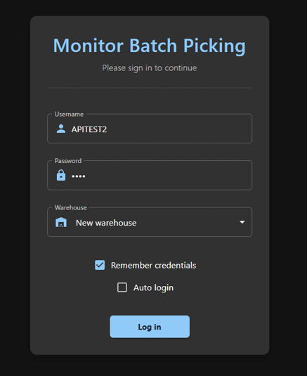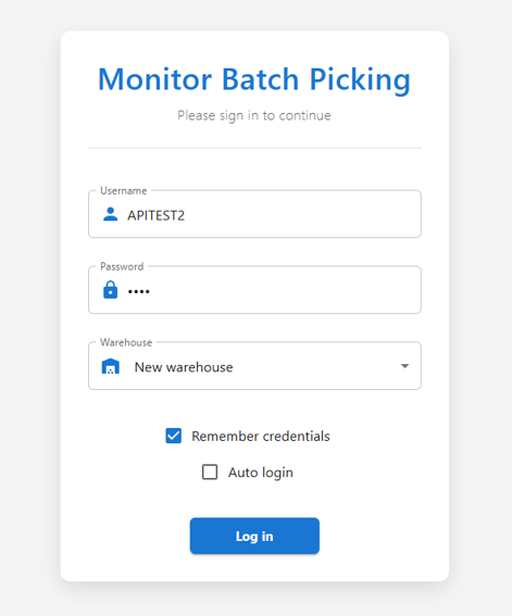 Användaren anger användarnamn och lösenord för Monitor-användaren de ska logga in med, samt vilket lagerställe de ska köra mot.