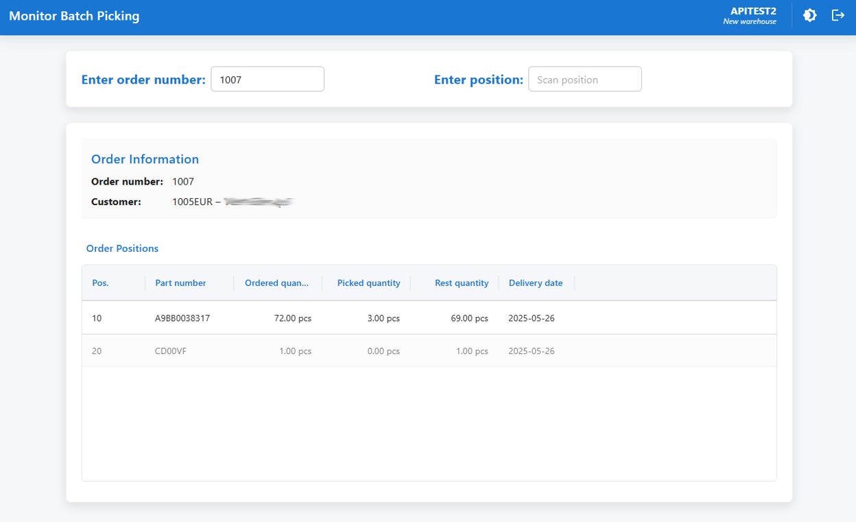När användaren valt rad visas information om orderraden samt vilka batcher som plockats för orderraden.
