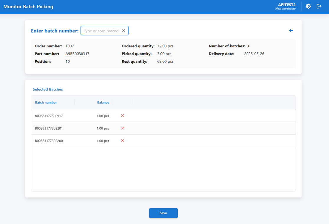 Batcher plockas genom att ange batchnummer i sökfältet, och plockade batcher kan tas bort genom att klicka på krysset på raden.
